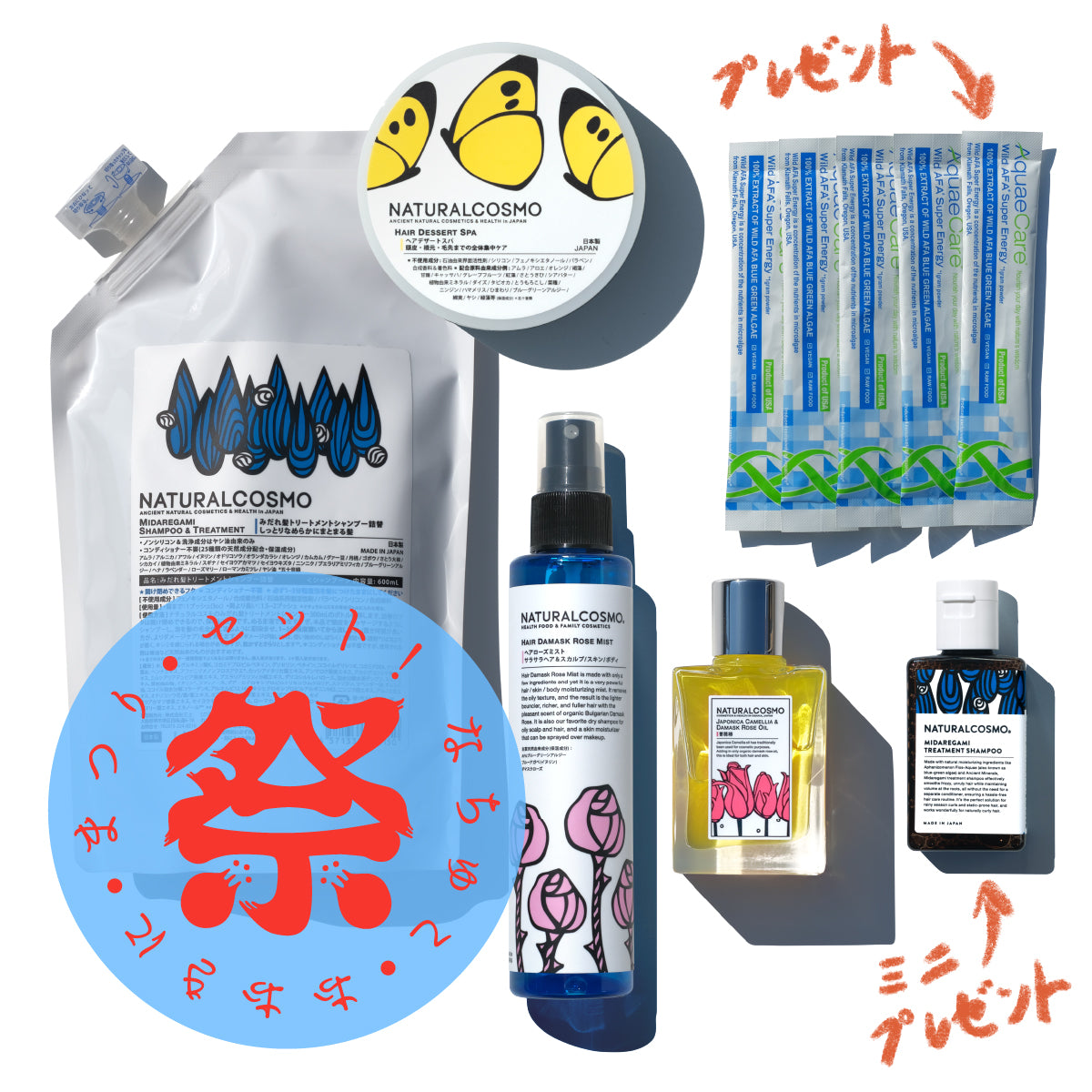 セットで使うと、足し算ではなく掛け算のように効果を発揮するナチュラルコスモ。ポップアップでのみ販売しているセット組み。世界中の人に買っていただけるように、たまーにネットでも買えるようにいたします。本当にたまーになんですが!みなさんと直接お会いできるイベントで、お悩みをお聞きしながらおすすめの組み合わせをご提案できたらいいのですが。。。